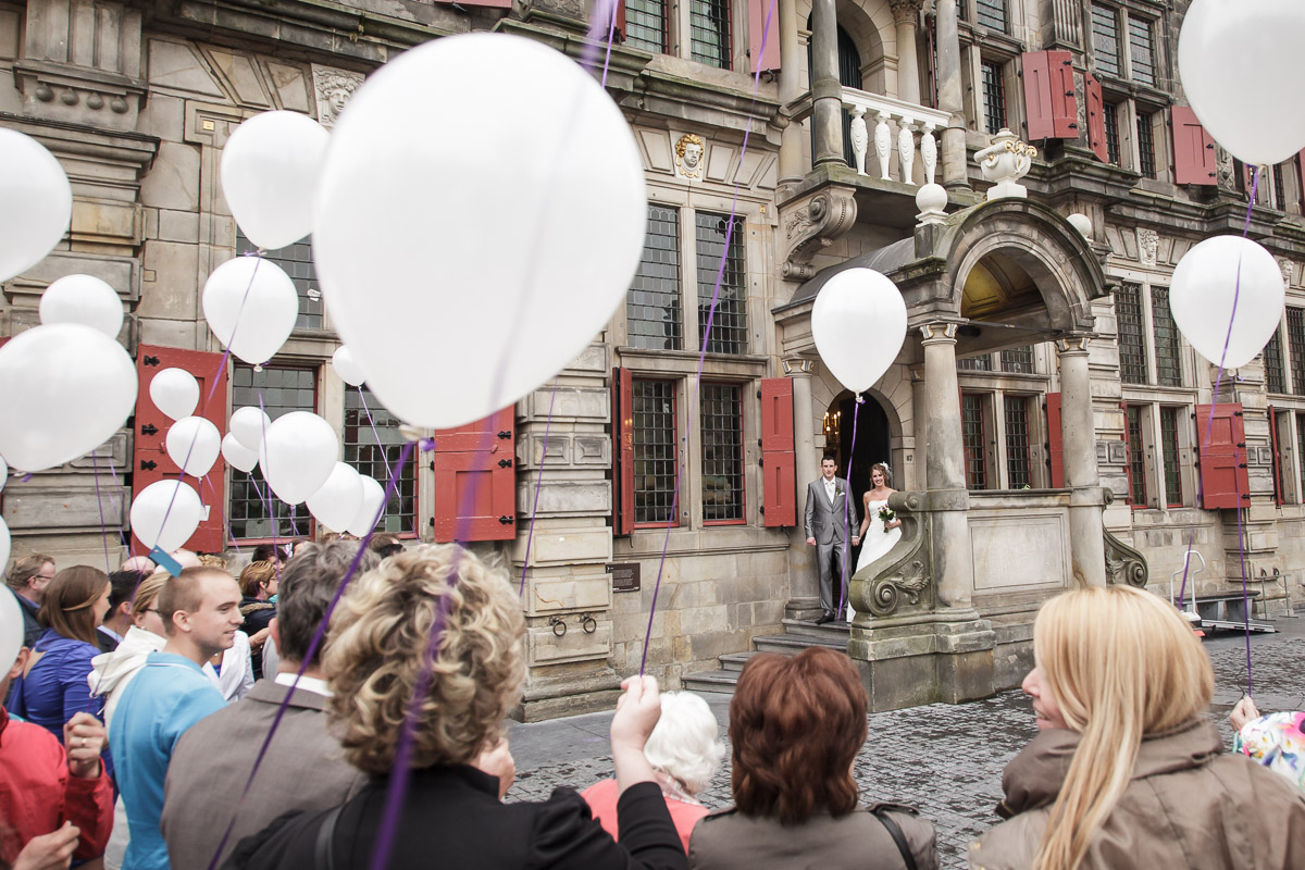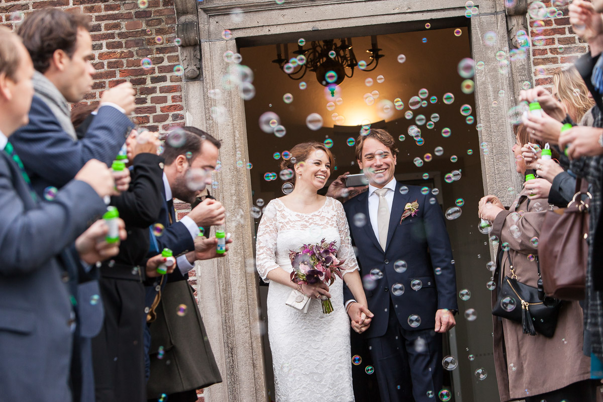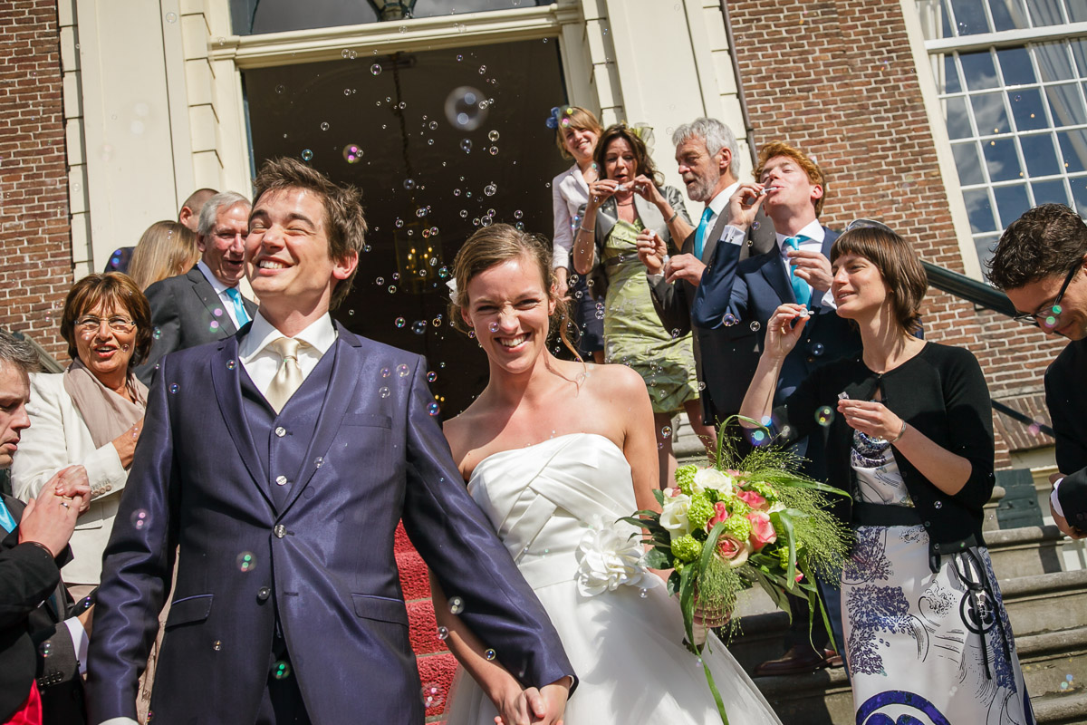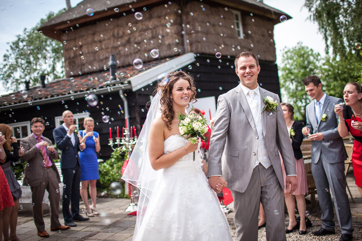 Na de ceremonie en de felicitaties gaan de gasten vaak eerst naar buiten om daarna het bruidspaar te ontvangen. Vroeger werd op dit moment altijd rijst gegooid over het bruidspaar als symbool van vruchtbaarheid. De reden dat dit nu vrijwel niet meer gebeurd is volgens mij niet omdat ze geen kinderen meer toegewenst worden, maar vooral omdat de trouwlocaties het niet meer waarderen dat na elke trouwdag de stoep vol licht met de kleine korrels. Voor een extra regel op de factuur mag er best nog wat rijst gegooid worden, maar toch wordt er dan meestal voor bellenblaas gekozen. We blijven Hollanders! Je kan zeggen wat je wilt, maar al die belletjes in de lucht rondom het bruidspaar is best vrolijk. [caption id="" align="aligncenter" width="1200"]