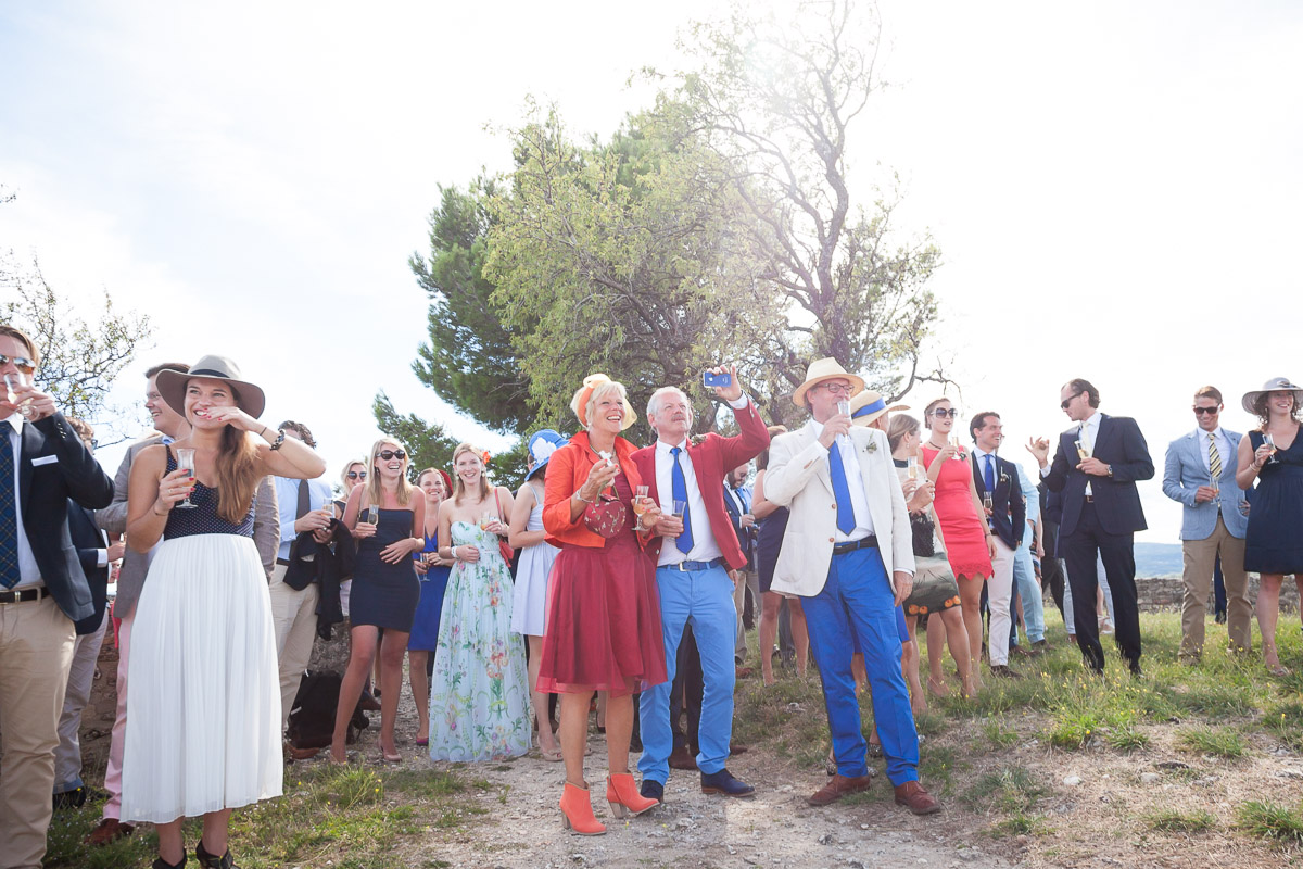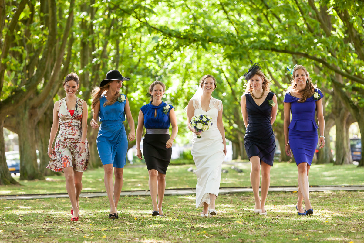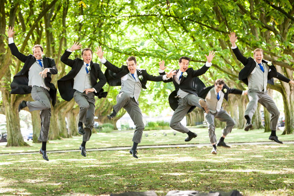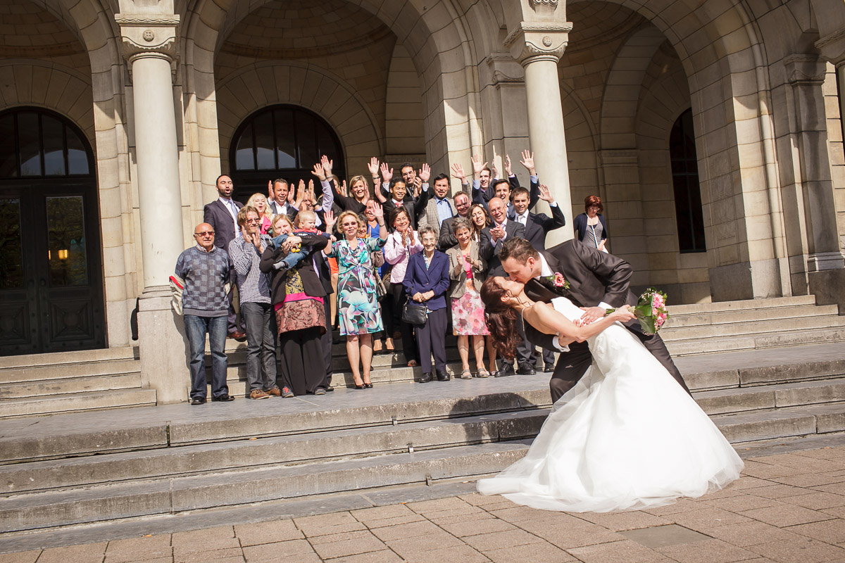 Het positioneren van alle gasten kan je uitgebreid doen als je wilt. Soms is het juist wel leuk om de groep een beetje rommelig te laten zijn, dat hangt een beetje af van het bruidspaar en wat voor dag zij er van maken. Ik vind het in ieder geval altijd wel belangrijk dat iedereen er volledig met zijn hoofd en liefst ook schouders op staat. Als je iedereen de lens in wilt laten kijken dan ontkom je er niet aan om even de aandacht te vragen en het gezelschap te laten weten wanneer je de foto gaat maken, zodat er geen mensen meer met elkaar staan te kletsen of de andere kant op kijken. Mijn manier om dit voor elkaar te krijgen is om de groep eerst te vertellen dat ik straks ga aftellen van 3 naar 2 naar1 en dat het dan het leukst is als iedereen mijn kant op wilt kijken met de mooiste glimlach die ze hebben. De camera instellingen en compositie is daarvoor allemaal al gemaakt. Als je dan begint met aftellen kan je op 3 en op 2 ook al een aantal foto’s maken en wanneer je op 1 en 0 bent aangekomen kan je al een hele serie gemaakt hebben. Als er dan geen goeie bij zit waar iedereen de lens in lacht, dan is dat gewoon jammer! Tot slot kan je de hele groep nog een keer laten juichen, zwaaien of gek laten doen, maar dikke kans dat je dan de helft van de mensen niet meer ziet omdat er een arm of hand voor het gezicht is.