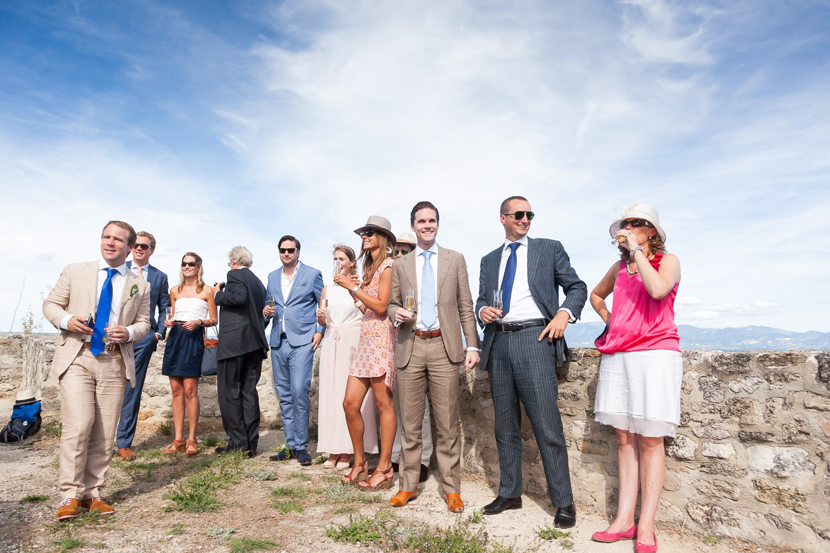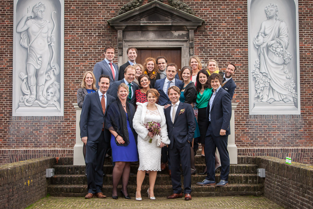 Na de ceremonie is een veel gekozen moment om een groepsfoto te maken van het hele gezelschap. Een grote trap waar alle gasten op passen is ideaal om iedereen goed in beeld te krijgen. Als die er niet is, dan kan je misschien wel een plekje vinden waar jij een stuk hoger kan staan dan de rest, zodat je iedereen van boven af kan fotograferen.